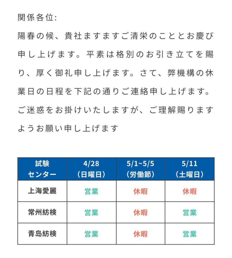 ]]>| 試験センタ- | 4/27 (日曜日) | 5/1~5/5 (労働 節(jié)) |
