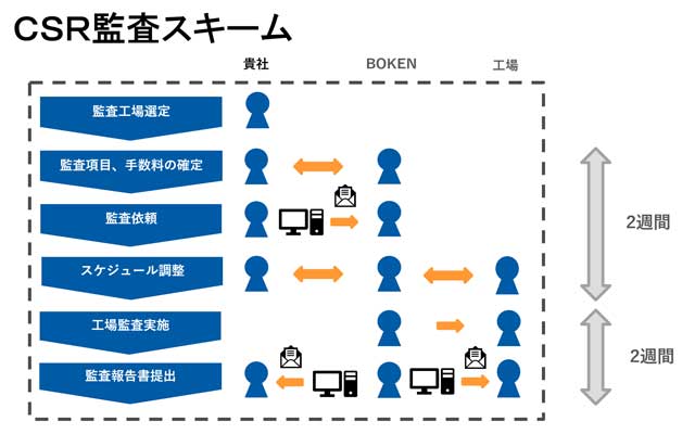またCSR監(jiān)査では、初回監(jiān)査を?qū)g施して終わりということではなく、不適合が出た場合は、そこからの改善是正がとても重要です。実際CSR監(jiān)査を?qū)g施させていただいていると、たくさんの不適合がでるという場合が多いのが現(xiàn)狀です。BOKENでは監(jiān)査後の改善點をどのように実施すればよいかをサポートするフォローアップ監(jiān)査を?qū)g施しております。BOKENはCSR監(jiān)査の経験実績から、工場様の抱える問題點を把握し、改善ができるまで、しっかりとサポートをしていきます。詳細はお問い合わせください。